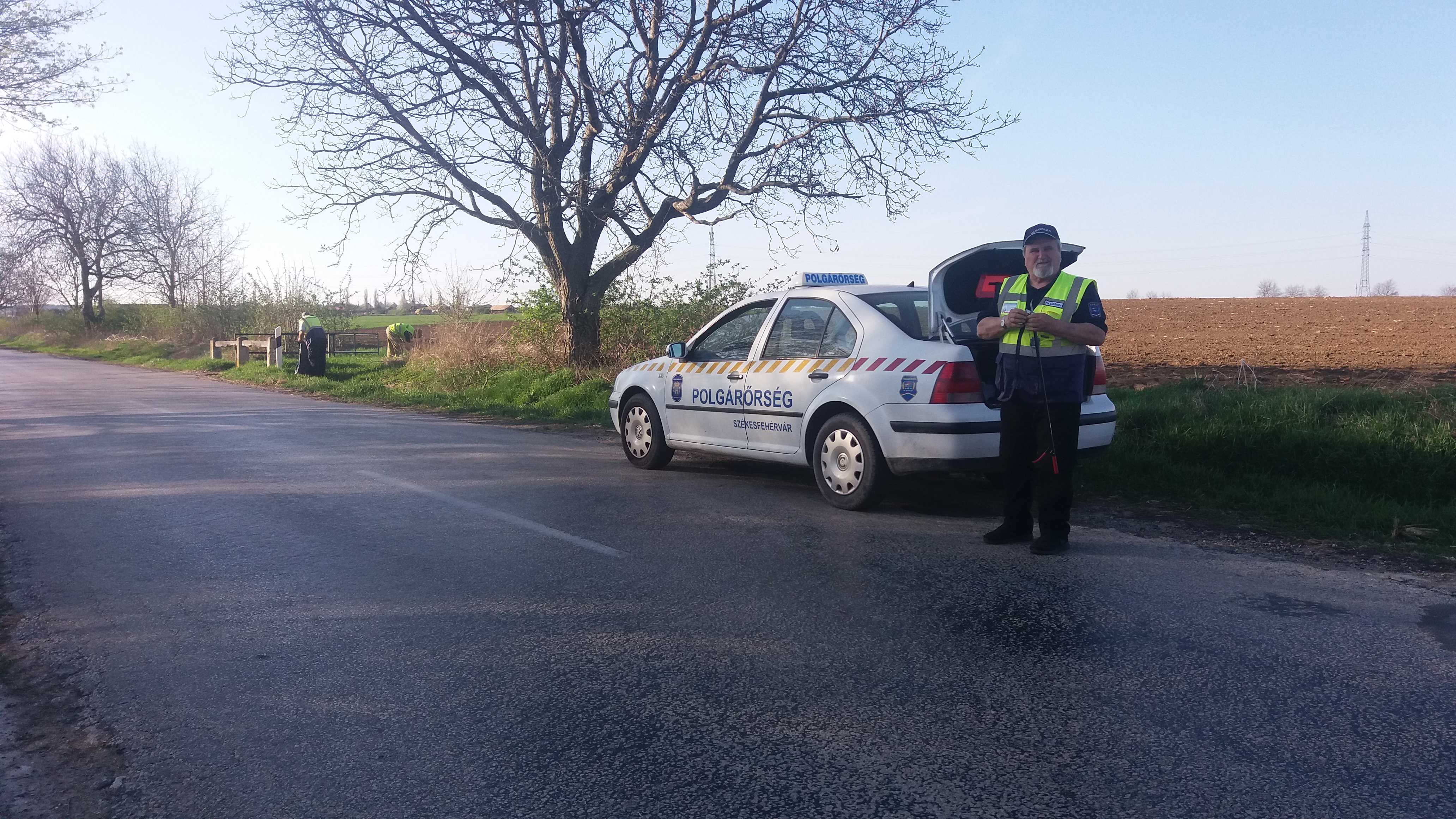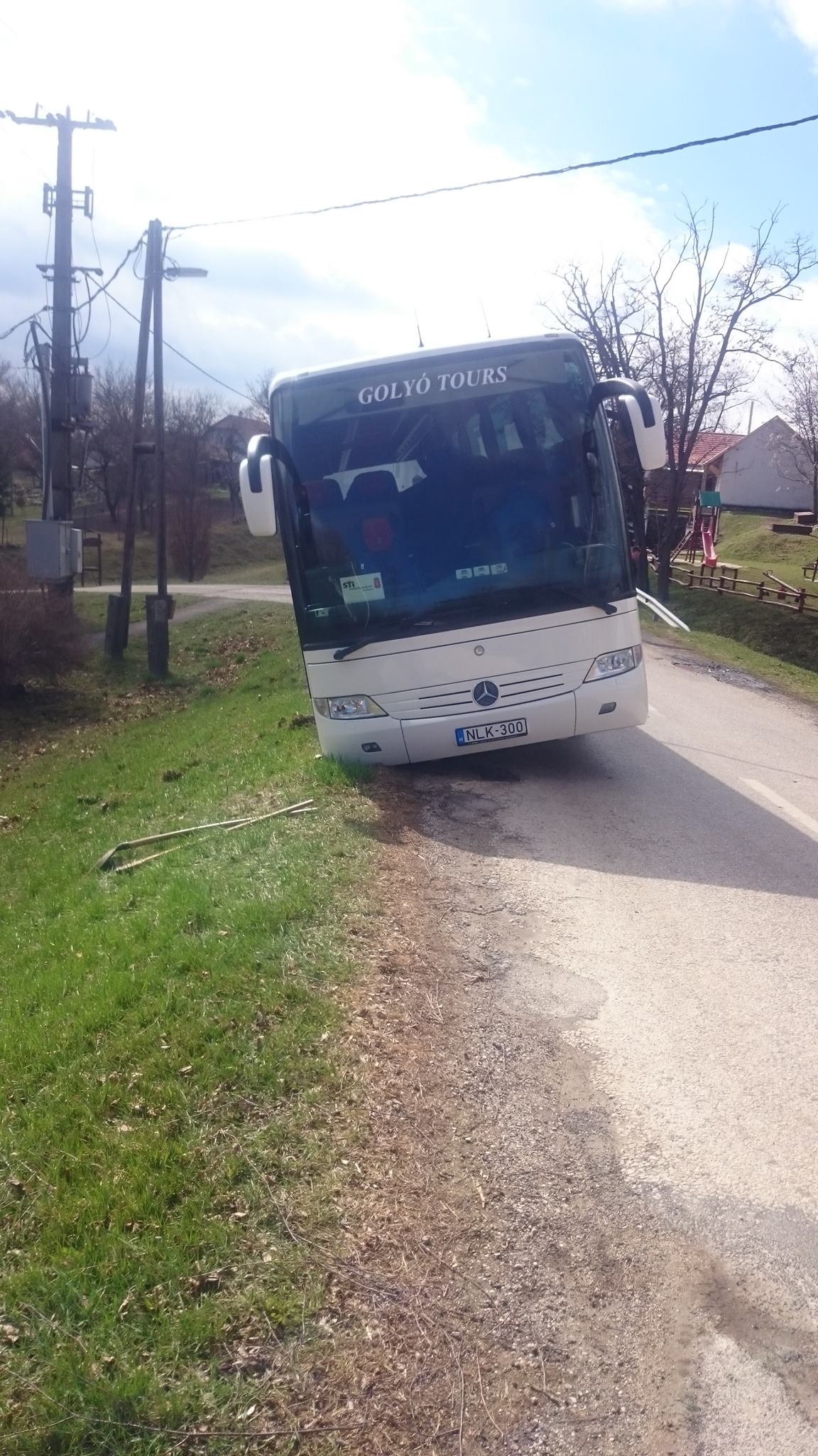 . Sarkament Jácint beszámolója: Ma András Gaál szolgálatban voltunk, jöttünk vissza Hétházpusztáról és Bakonykútiban láttuk, hogy árokba csúszott egy busz. Személyi sérülés nem történt, mivel a turistákért üresen jött a busz. András értesítette a Katasztrófavédelmet és míg az autóbusz műszaki mentése zajlott, addig lezártuk az utat.